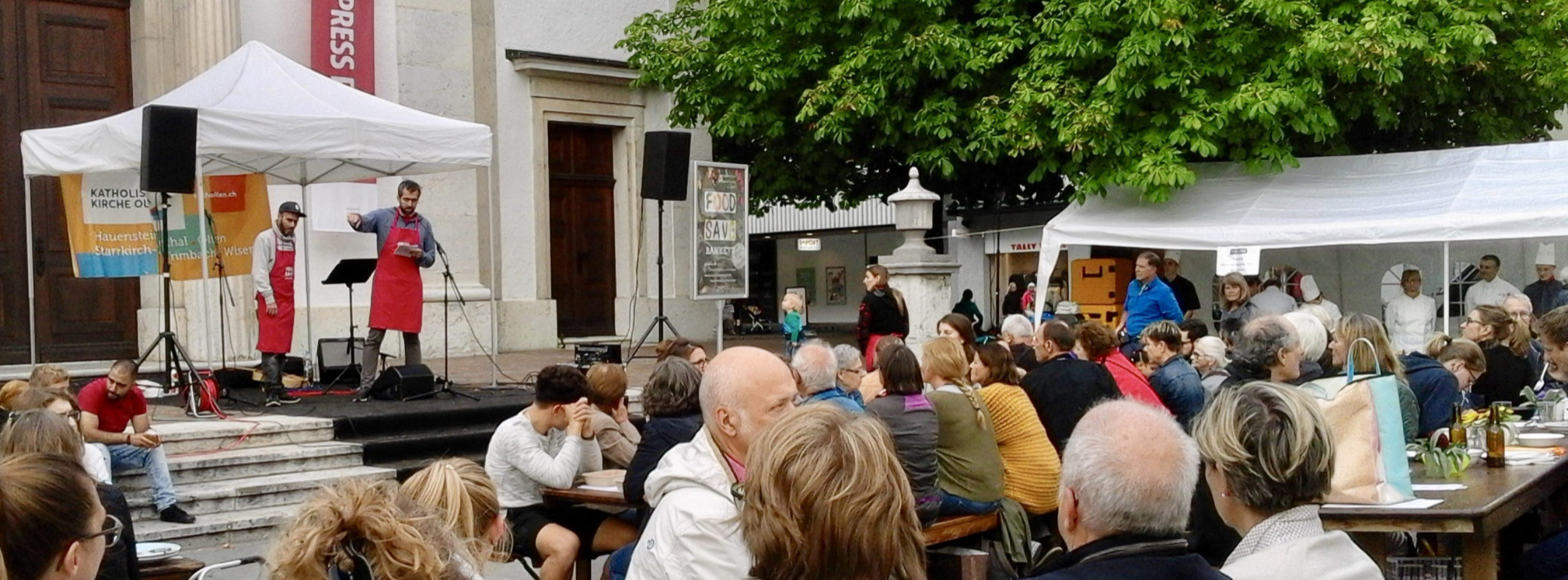 Das Foodsave Bankett wird von der katholischen Kirche, den Projekten Essen für Alle und RestEssbar von Olten im Wandel sowie weiteren engagierten Menschen organisiert.  In einer gemeinsamen Rede mit Relokal-Mitgründer Tobi Vega haben wir aufgezeigt, wo entlang der Kette vom Feld bis zum Konsument rund 30% der Lebensmittel weggeworfen werden. Einerseits wird viel Gemüse entsorgt, weil es nicht den standardisierten Grössen entspricht oder zu viel produziert wurde. Hier setzt Relokal an und bezieht dieses Gemüse, welches dann an lokale Konsument*innen in Olten verkauft wird.  Andererseits findet ein Drittel der Lebensmittelverschwendung bei uns allen zu Hause statt. Hier haben wir mit 7 einfachen Tipps versucht Abhilfe zu schaffen:
