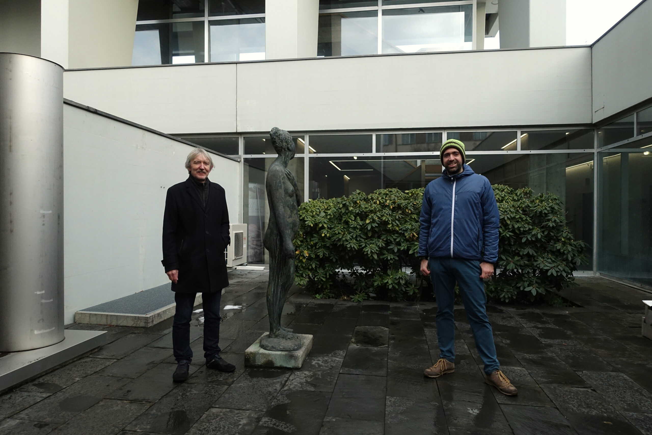 Der Online-Stadtrundgang startete für die knapp zwanzig Kunstinteressierten auf dem Bifangplatz, beim 1995 zum fünfzigsten Jubiläum der Mio gestalteten Brunnen. Die Umgebung des benachbarten BBZ ist gleich mit drei abstrakten Holz- und Eisenplastiken gestaltet. Für eine Bildungsinstitution ist das typisch – ist doch der Kanton eine wichtige Käuferin von Kunst im öffentlichen Raum. Der Spaziergang führte durch die Winkelunterführung, zu den drei Engeln an der Fassade der Alpiq. Anfangs Fünfzigerjahre von der damaligen Atel bestellt, gewähren sie Einblick in die Geschichte des Firmen-Mäzenatentums und den Fortschrittsglauben der Nachkriegsjahre. Etwas jünger, aber zum Zeitpunkt seiner Einweihung sehr umstritten ist das populäre Reiterdenkmal am Kopf der Bahnhofbrücke. Von dessen Sockel aus ist die markante blau-grüne Gewässerschutzplastik beim Ländiweg zu sehen. Im Geist der späten Sechzigerjahre aus Polyester geformt, stellt die Plastik heute die Denkmalpflege vor Probleme: sie ist über die Jahrzehnte spröde geworden. Überhaupt sei der Unterhalt von Kunst im öffentlichen Raum alles andere als einfach und werde vielerorts aus Kostengründen vernachlässigt, so Christof Schelbert. Als jüngstes städtisches Denkmal besichtigte die Gruppe das Abbild des «Königs von Olten» aus dem Jahr 2018 auf dem Kaplaneiplatz. Den Steinelefanten auf dem Platz der Begegnung zeigte Schelbert später als Beispiel eines Kunstwerks, von dem heute nicht mehr ganz klar ist, wie es zu seinem heutigen Standort kam. Als Objekt, das umgekehrt nicht an seiner ursprünglichen Stelle steht, zeigte er den mächtigen abstrakten Eisenstorch, der einst vom Platz der Begegnung in den Stadtpark verlegt wurde. Auch Wandmalereien wurden gewürdigt, so etwa das Wandbild im Ratsaal mit seinen subtil nuancierten Farbtönen und dem surrealistischen Bildnis von St. Martin im angrenzenden Pausenraum. Die Führung endete im angrenzenden Innenhof des Stadthauses, wo drei sich auf spannende Weise ergänzende Werke aus verschiedenen Epochen ausgestellt sind.